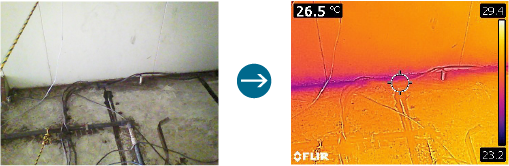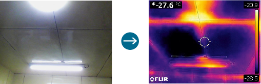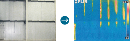 構造上、プレハブパネルから冷気が流出してしまう部分があります。そこがプレハブパネルの弱点です。紹介しているのは実際の写真とその部分のサーモグラフィーの画像です。温度が高い部分は赤色、低い部分は青色で表現されます。これらの画像から継ぎ目の部分で熱損失をしていることが分かります。